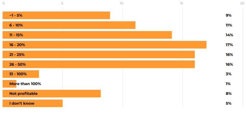 La cantidad de dinero generada en ventas está muy bien, pero lo que de verdad importa es la cantidad que te quedas a final de mes en beneficios. Como vemos debajo, dos de cada tres vendedores consiguen un margen de más del 10%. Más o menos la media sería de 15%.