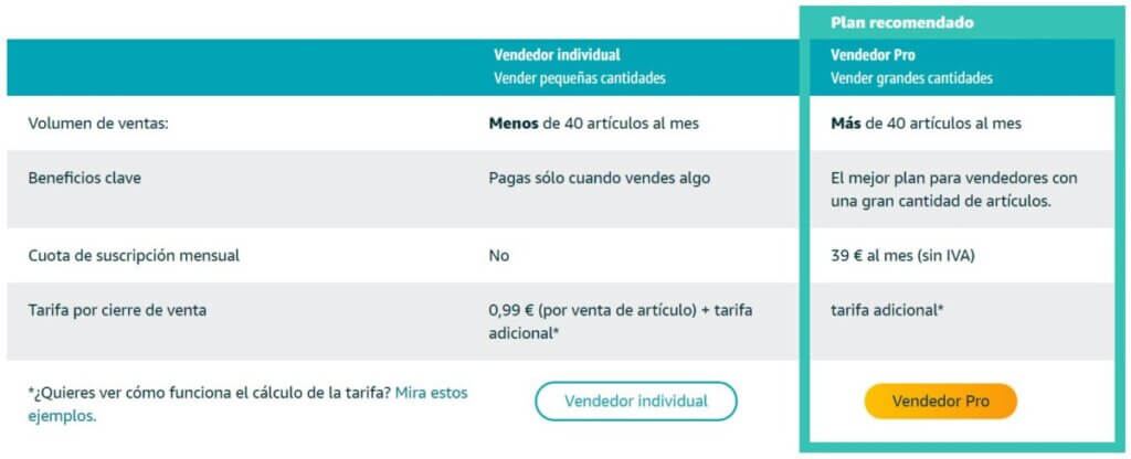 - Individual = Es gratis, no tiene suscripción mensual. Eso sí, tendrás que pagar una comisión de 0,99€ por cada artículo que vendas. Ten en cuenta que tiene algunas restricciones como no poder vender más de 40 productos por mes.