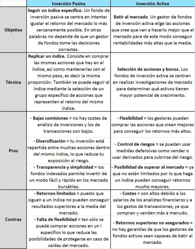 Aquí te dejo un cuadro resumen con la diferencia entre inversión pasiva e inversión activa.