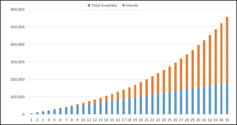 Como puedes ver arriba, si ahorras 5.000 euros al año y los inviertes, puedes llegar a hacer crecer tu dinero desde los 175.000€ (35 x 5.000€, azul) que habrías ahorrado, hasta casi 560.000 euros que acabarías teniendo al incluir los retornos de tus inversiones (382.000€, naranja).